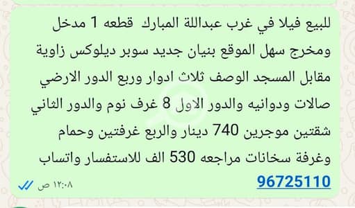 للبيع فيلا في غرب عبداللة المبارك قطعه 1 مدخل ومخرج سهل بنيان جديد سوبر ديلوكس الموقع زاوية مقابل المسجد الوصف ثلاث ادوار وربع الدور الارضي صالات ودوانيه والدور الاول 8 غرف نوم والدور الثاني شقتين موجرين 740 دينار والربع غرفتين وحمام وغرفة سخانات مراجعه 530 الف للاستفسار واتساب