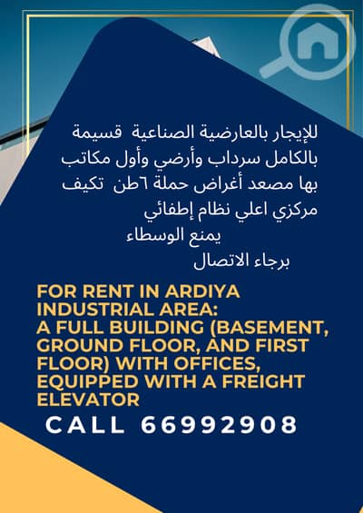 للإيجار بالعارضية الصناعية قسيمة بالكامل سرداب وأرضي وأول مكاتب بها مصعد أغراض حملة ٦طن تحميل وتنزيل ومصعد افراد تكيف مركزي اعلي نظام إطفائي علي حسب شروط وزارةالاطفاء موقع مميز جدا قوة كهرباء عالية جدا تصلح جميع الأنشطة تجهيزات غذائية او ادارة شركات اومخازن وادارة لأي نشاط آخر يمنع الوسطاء برجاء الاتصال للجادين فقط