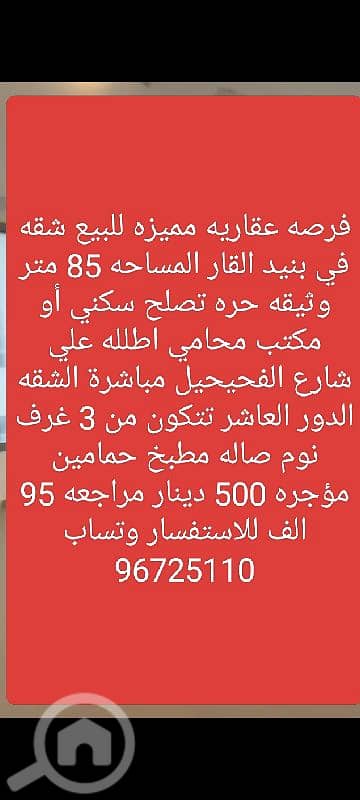 فرصه عقاريه مميزه للبيع شقه في بنيد القار المساحه 85 متر وثيقه حره تصلح سكني أو مكتب محامي اطلله علي شارع الفحيحيل مباشرة الشقه الدور العاشر تتكون من 3 غرف نوم صاله مطبخ حمامين مؤجره 500 دينار مراجعه 95 الف للاستفسار وتساب
