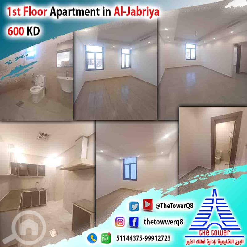 For rent in Jabriya – 1st floor apartment – Super deluxe finishing – 4 bedrooms (2 master rooms – 2 rooms shared bathroom) – Big hall – Nanny’s room with bathroom – Laundry room – Equipped kitchen – Shaded parking.
