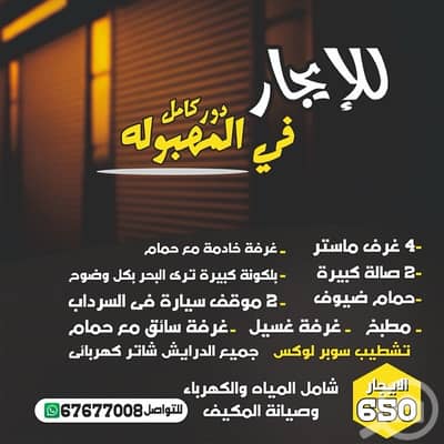 دينار650شهرياًشقة46المساحة:250 متر مربعللإيجار دور كامل 4 غرف ماستر المهبوله تشطيب سوبر لوكسمهبولة، مدينة الكويت الإيميل اتصل