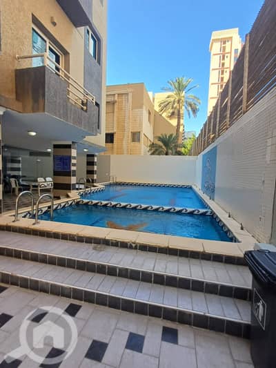 For rent, an apartment + Balacony in Al-Shaab Al-Bahri - Super deluxe finishing - In an upscale residential complex - 2 master bedrooms - Nanny's room with bathroom – Hall with guest bathroom - Equipped kitchen - Shaded parking.