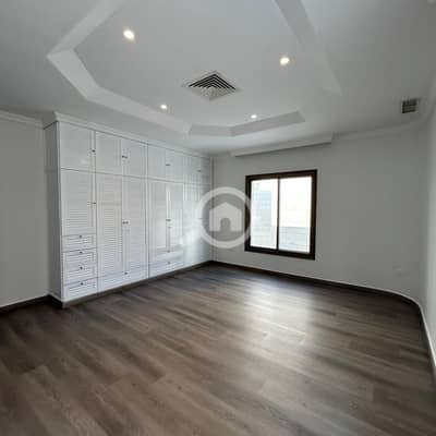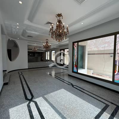 This three-story villa with a rooftop terrace features a super deluxe finish. The basement includes a storage room and parking for 12 cars. The ground floor comprises a large living room, a majlis (formal reception room), a large fully equipped kitchen, a dining room, a bedroom, a laundry room, two bathrooms, and an outdoor courtyard with an outdoor seating area. It also includes a fully equipped central kitchen, a laundry room, a maid's room, a driver's room, and a bathroom, with separate entrances to the bedrooms. The first floor features a living room, five bedrooms (one master with a dressing room), and two bathrooms serving the four bedrooms. The rooftop includes a maid's room and a bathroom. Parking is available in front of the villa. Water, electricity, and AC maintenance are included. For families only.