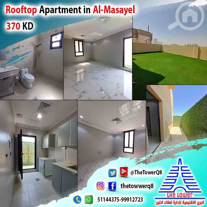 For Rent: Rooftop Apartment in Al-Masayel – Super Deluxe finishing – 2 bedrooms with 1 bathroom – Hall with guest bathroom – Nanny's room with Bathroom - Equipped kitchen – Large rooftop – Shaded parking.
