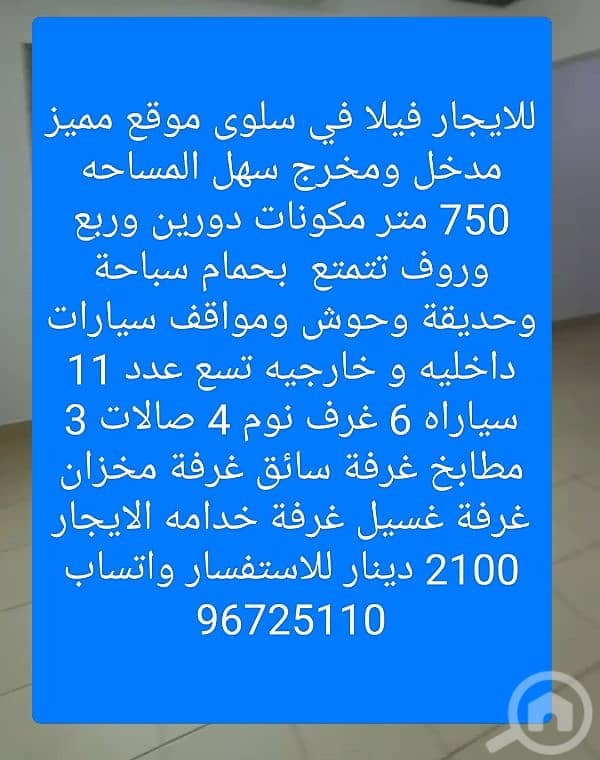 للايجار فيلا في سلوى موقع مميز مدخل ومخرج سهل المساحه 750 متر مكونات دورين وربع وروف تتمتع بحمام سباحة وحديقة وحوش ومواقف سيارات داخليه و خارجيه تسع عدد 11 سياراه 6 غرف نوم 4 صالات 3 مطابخ غرفة سائق غرفة مخزان غرفة غسيل غرفة خدامه الايجار 2100 دينار للاستفسار واتساب