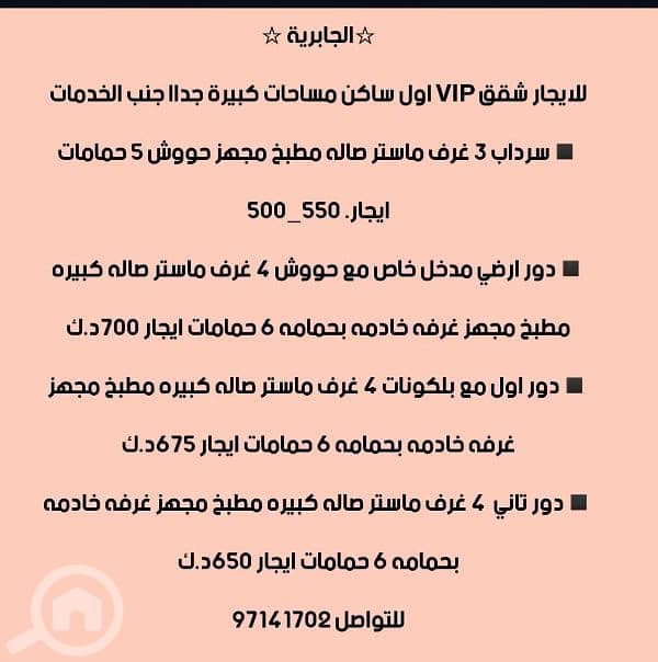 Al-Jabriya VIP apartments for rent, brand new, very spacious, near services. Basement: 3 master bedrooms, living room, equipped kitchen, yard, 5 bathrooms. Rent: 500-550 KD. Ground floor: Private entrance with yard, 4 master bedrooms, large living room, equipped kitchen, maid's room with bathroom, 6 bathrooms. Rent: 700 KD. First floor with balconies: 4 master bedrooms, large living room, equipped kitchen, maid's room with bathroom, 6 bathrooms. Rent: 675 KD. Second floor: 4 master bedrooms, large living room, equipped kitchen, maid's room with bathroom, 6 bathrooms. Rent: 650 KD. Contact: